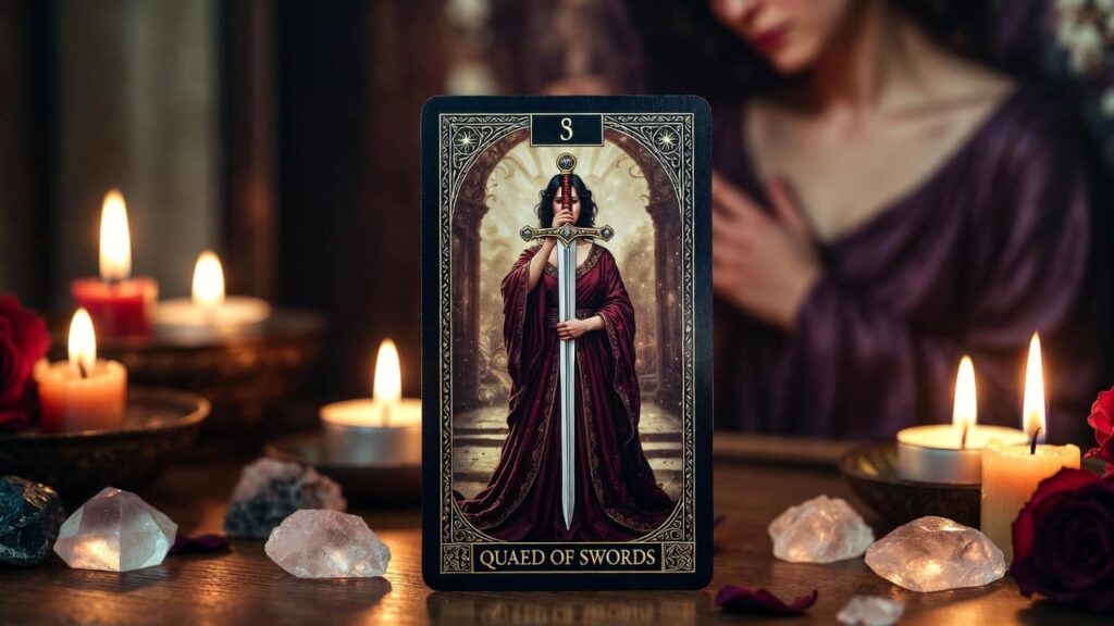 Queen of Swords, clarity, intellect, honesty. Cuts through drama. Speak clearly, set boundaries, use brain, not just feelings.